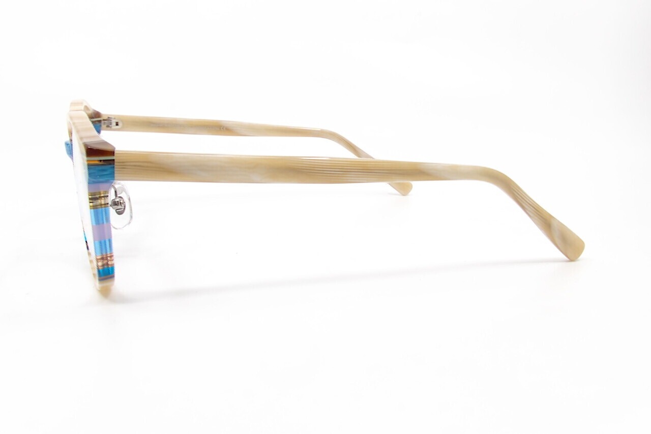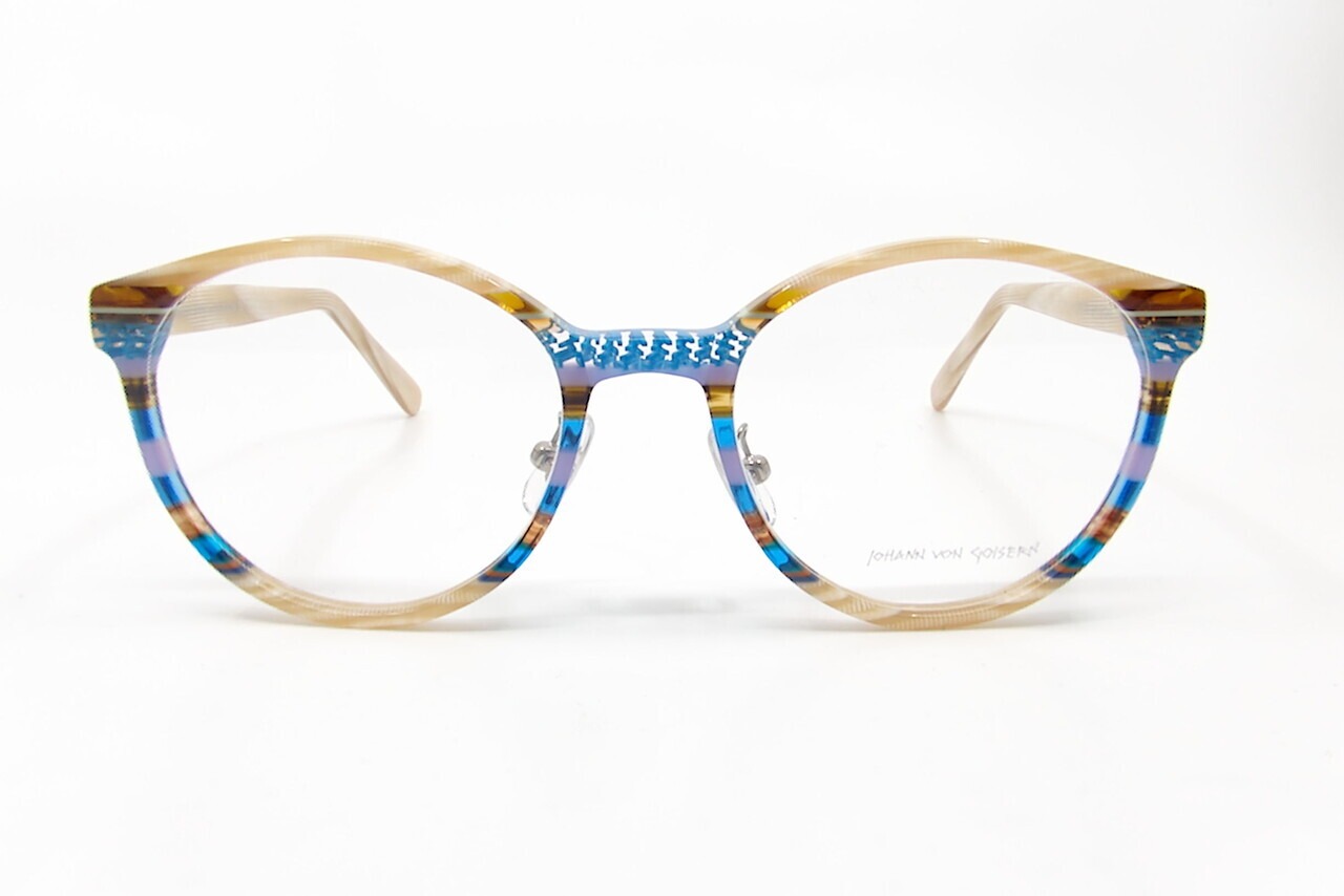 クセのないシンプルなデザインのフロントパーツは"Johann von Goisern"の特徴である独自の技術による鮮やかなアセテート板の積層生地を使用しています。