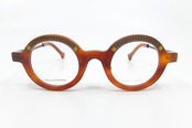 比較的シンプルなラウンドデザインのフロントのリム上部にはストライプの彫金の入ったチタンパーツが取り付けられておりチャーミングな眉毛を表現しています。