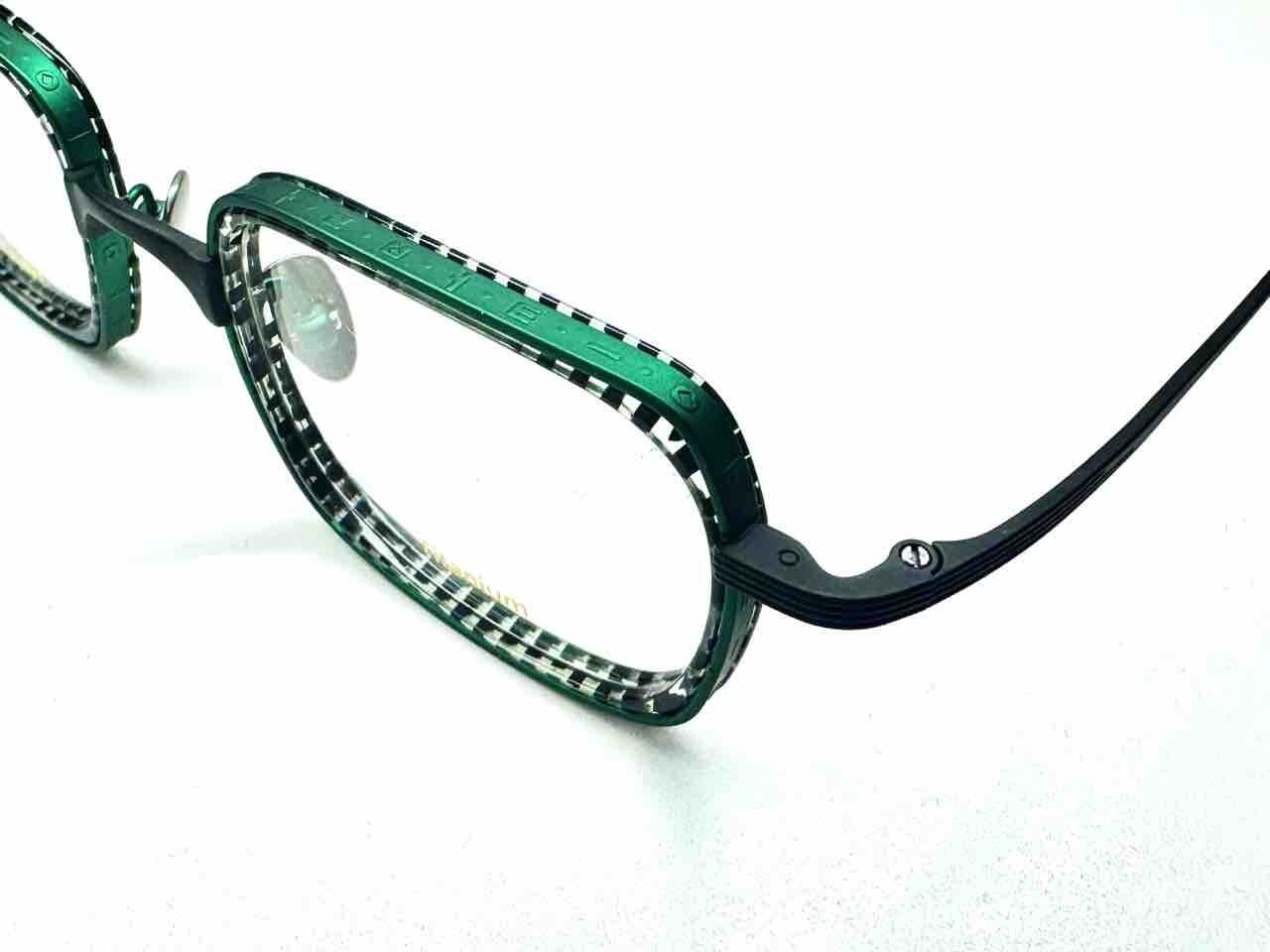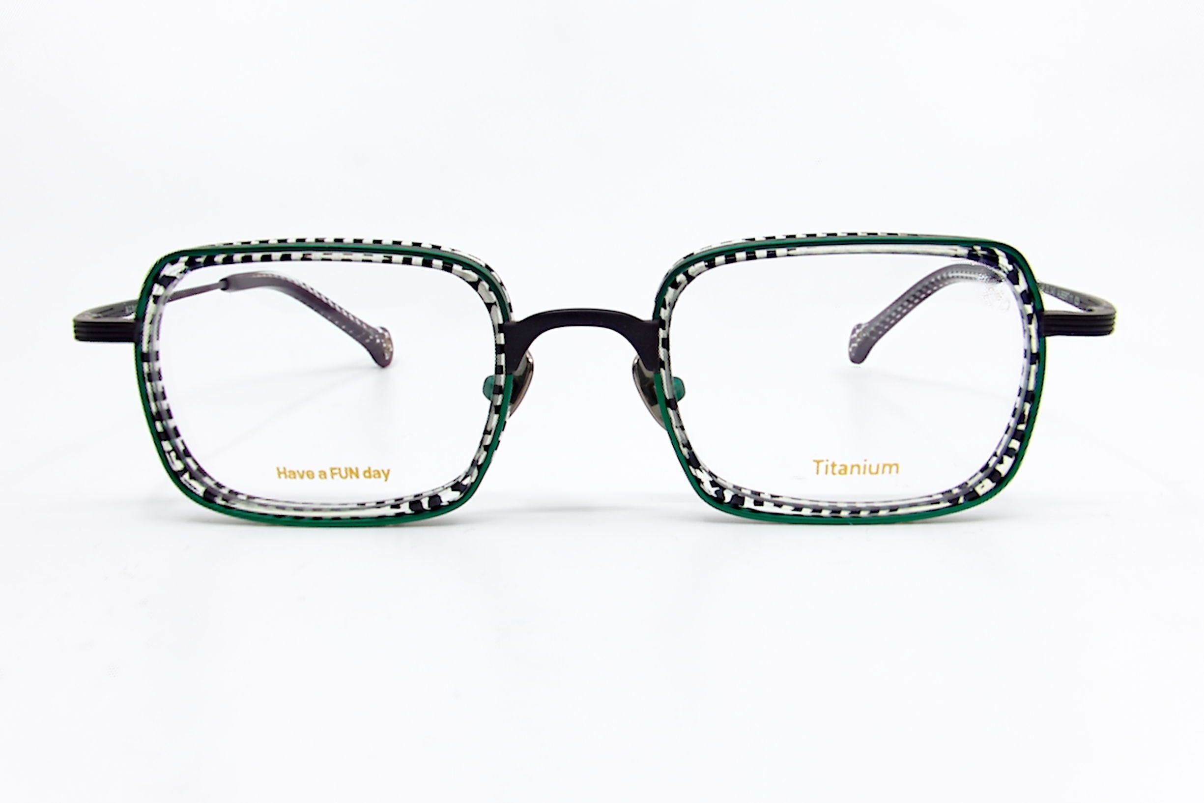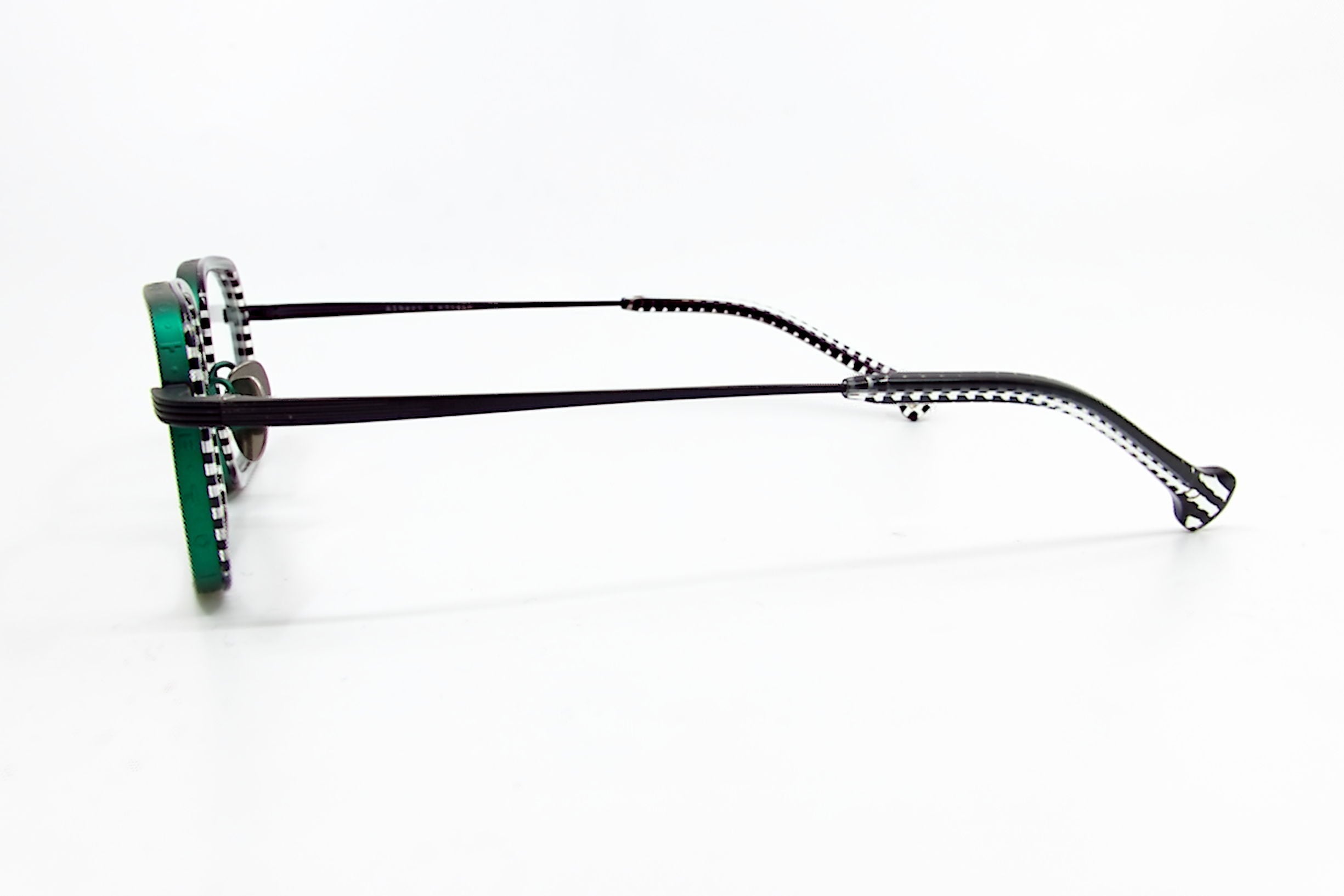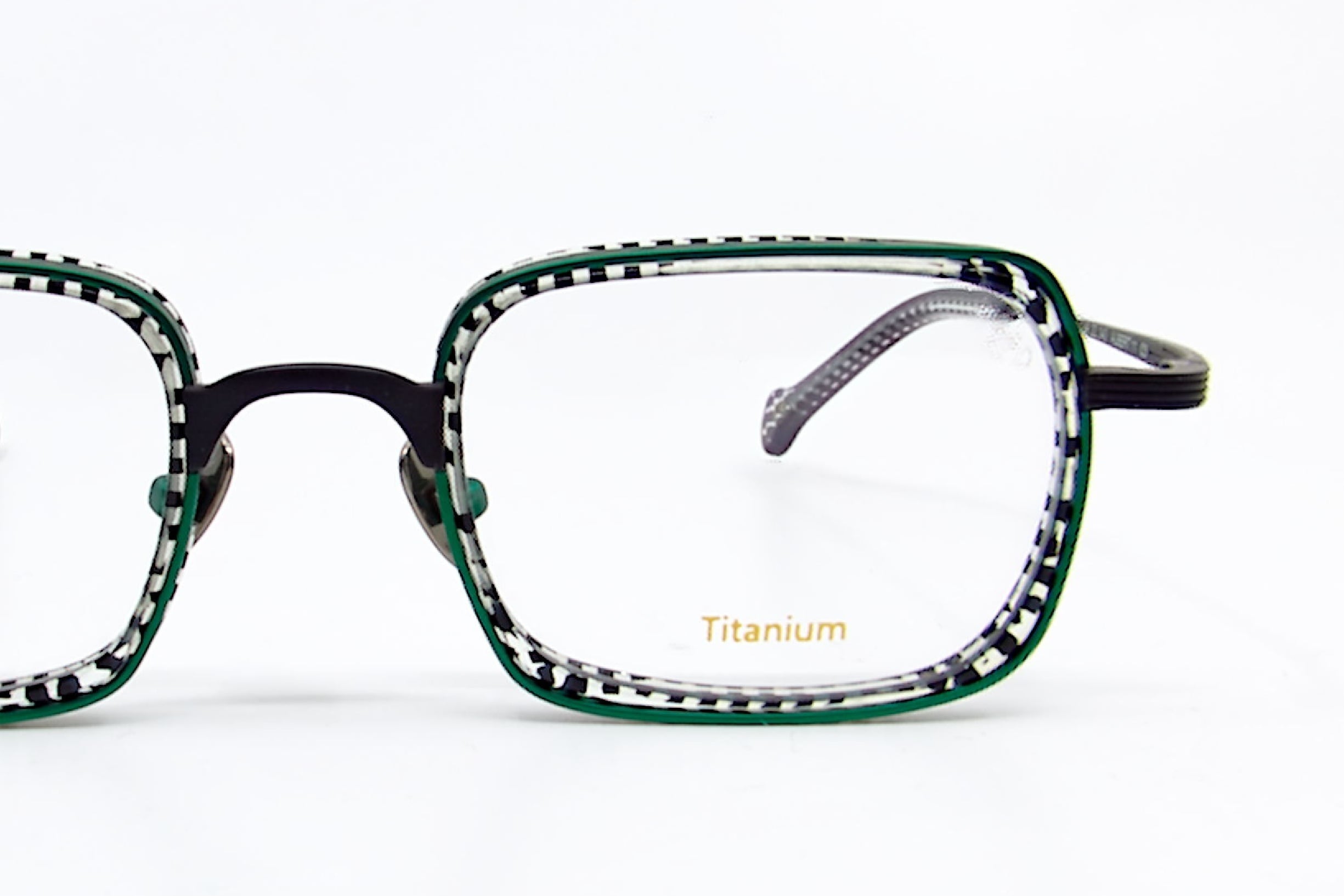 カラーC05は鮮やかなグリーンのリムとマットブラックのブリッジとテンプルのメタルパーツとクリアにブラックのドット柄アセテートパーツの組み合わせになっています。