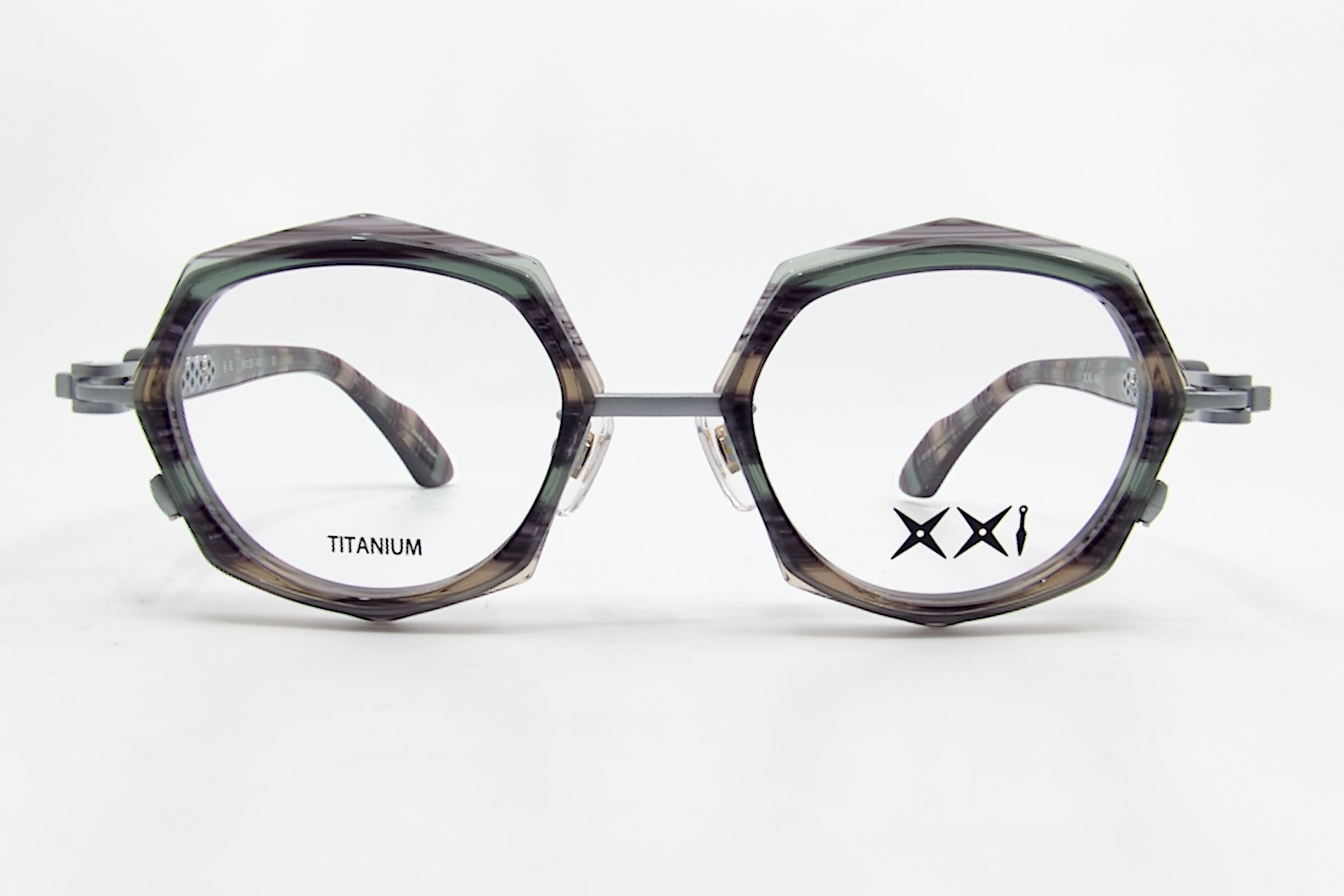 カラー「シロガネは」艶消しシルバーのチタンパーツと淡いクリアブルー、クリアグレー、ブラウンのササ柄のアセテート生地の組み合わせ。