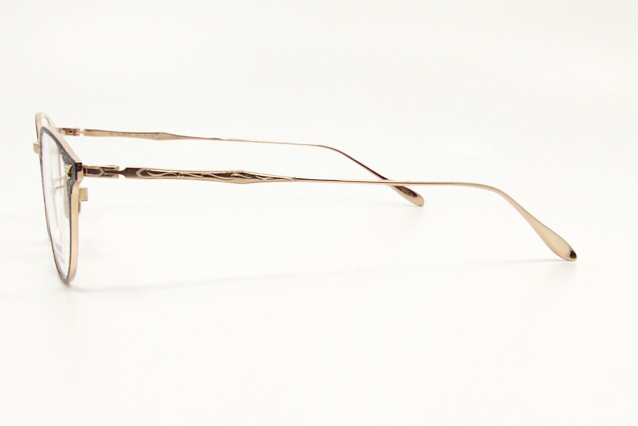 フロント、テンプルにチタンを使用しています。 ベースカラーはゴールドですがフロントの前面にのみレザー調のプリントが施されています。 仕上がり、質感もしっかりおり近年の印刷技術の凄さには驚かされます。 レンズの玉型はやわらかい印象のボスリントン。 テンプルは剣のような美しいシェイプを描いた"LTテンプル"を採用しています。 全体的に高級感がありかける人に気品さを与えてくれる....そんな1枚です。