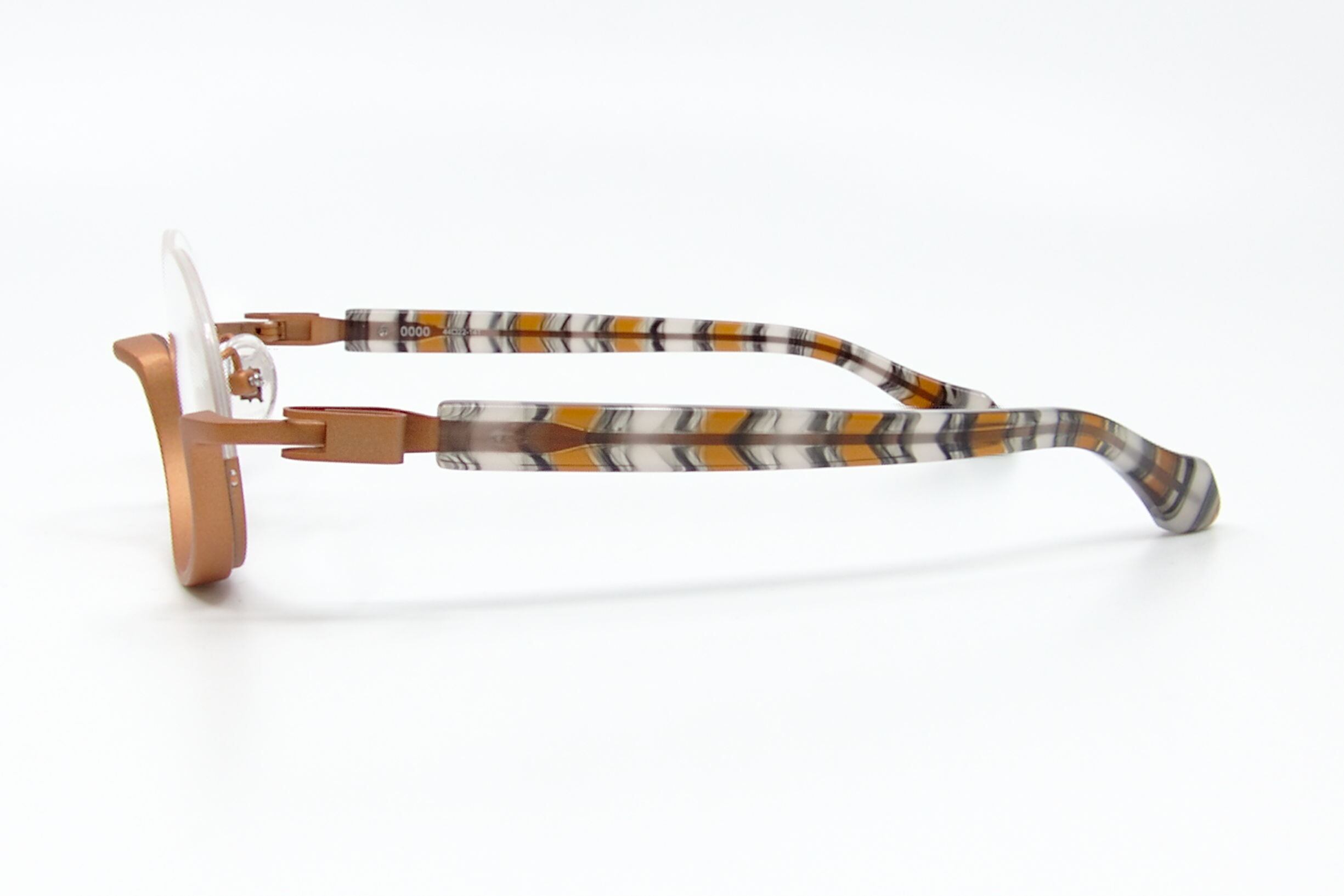 0000(オレオレ)は半円デザインのメタルリムにカモの羽柄のセルテンプルを組み合わせたコンビネーションデザインになっています。