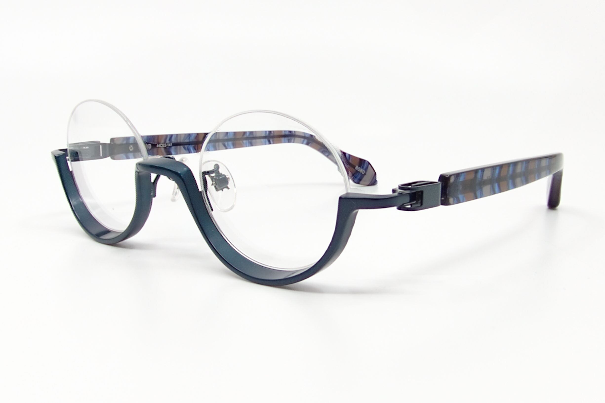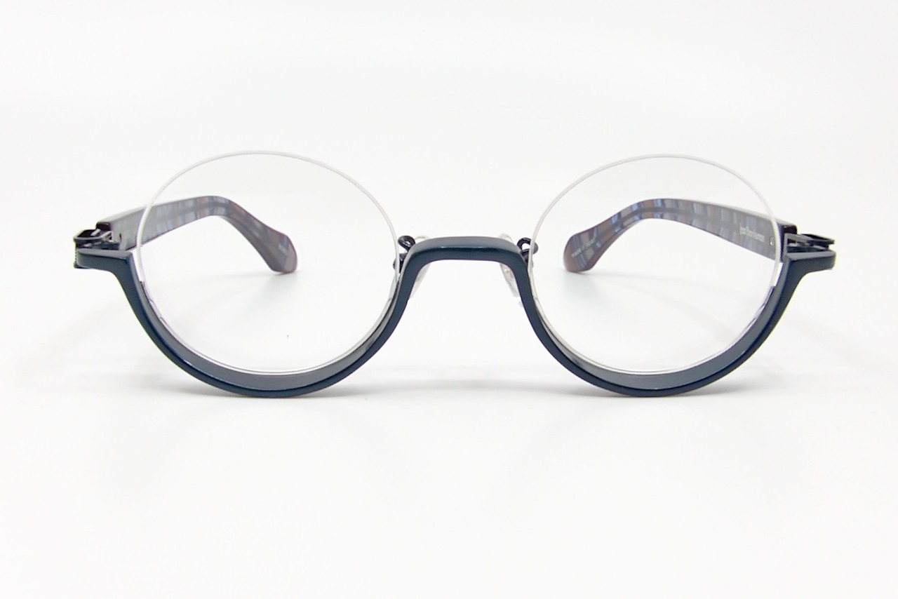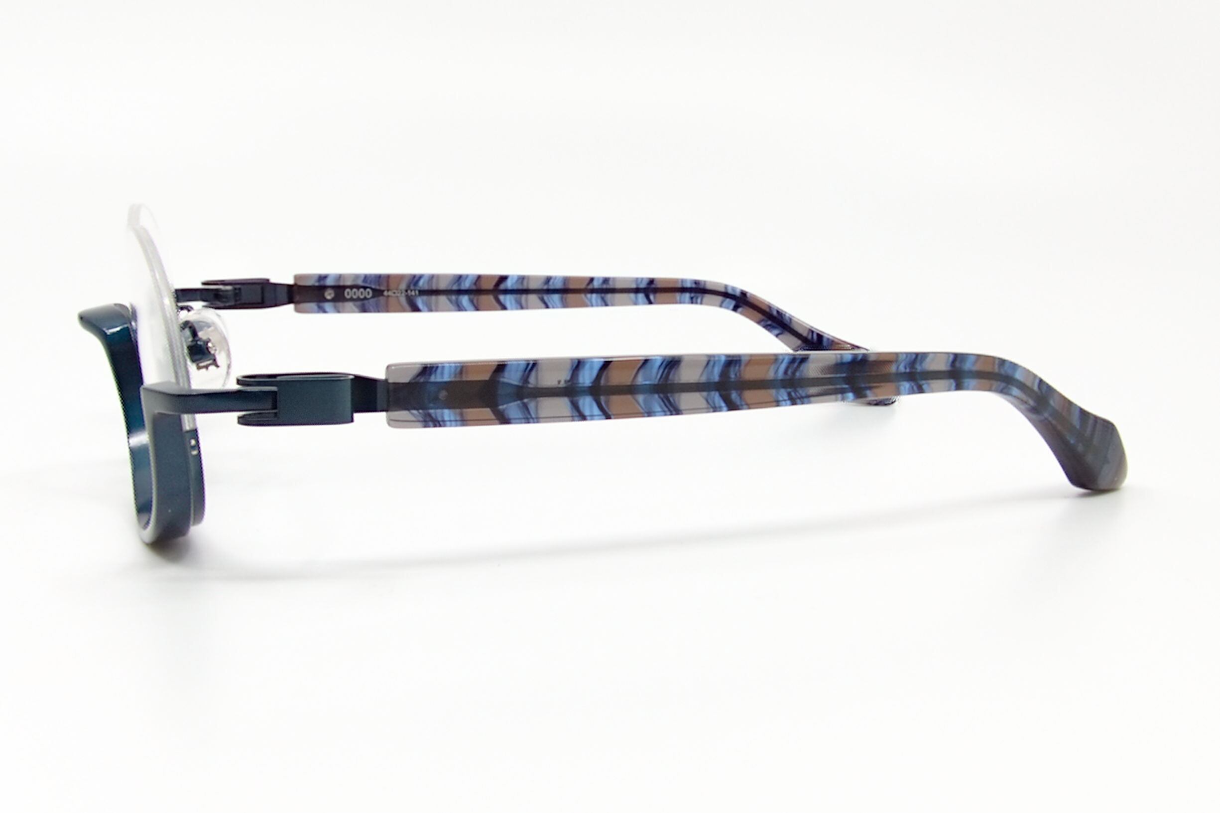 0000(オレオレ)は半円デザインのメタルリムにカモの羽柄のセルテンプルを組み合わせたコンビネーションデザインになっています。