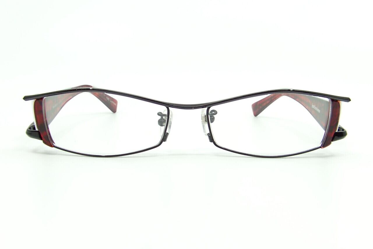 細いメタルに取り付けられたアセテートのテンプルの太さに圧倒されますが思いの外かけやすくこちらも程よく個性をアピールするポイントになっています。