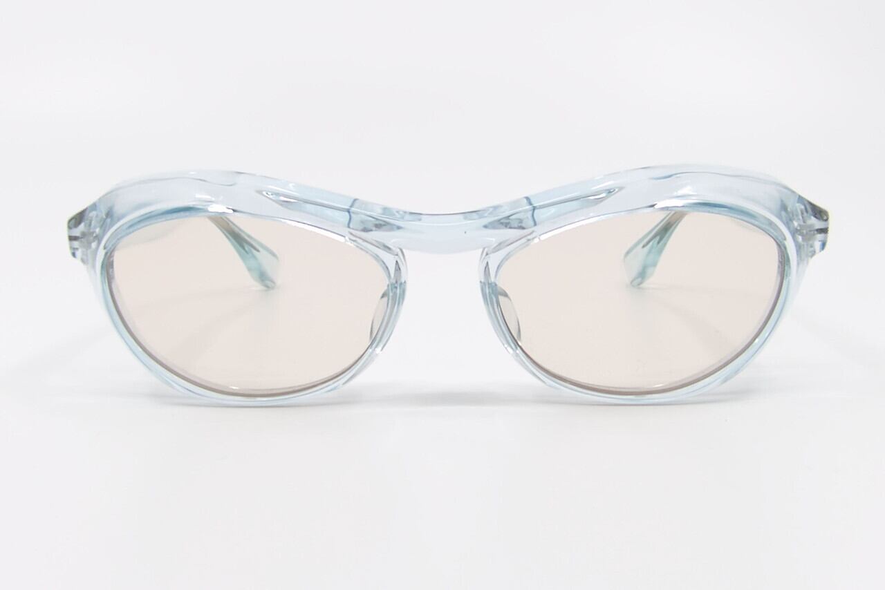 太い弧を描いたブリッジがそのまま流れるようにフード状にレンズを包み込んだ様なデザイン。