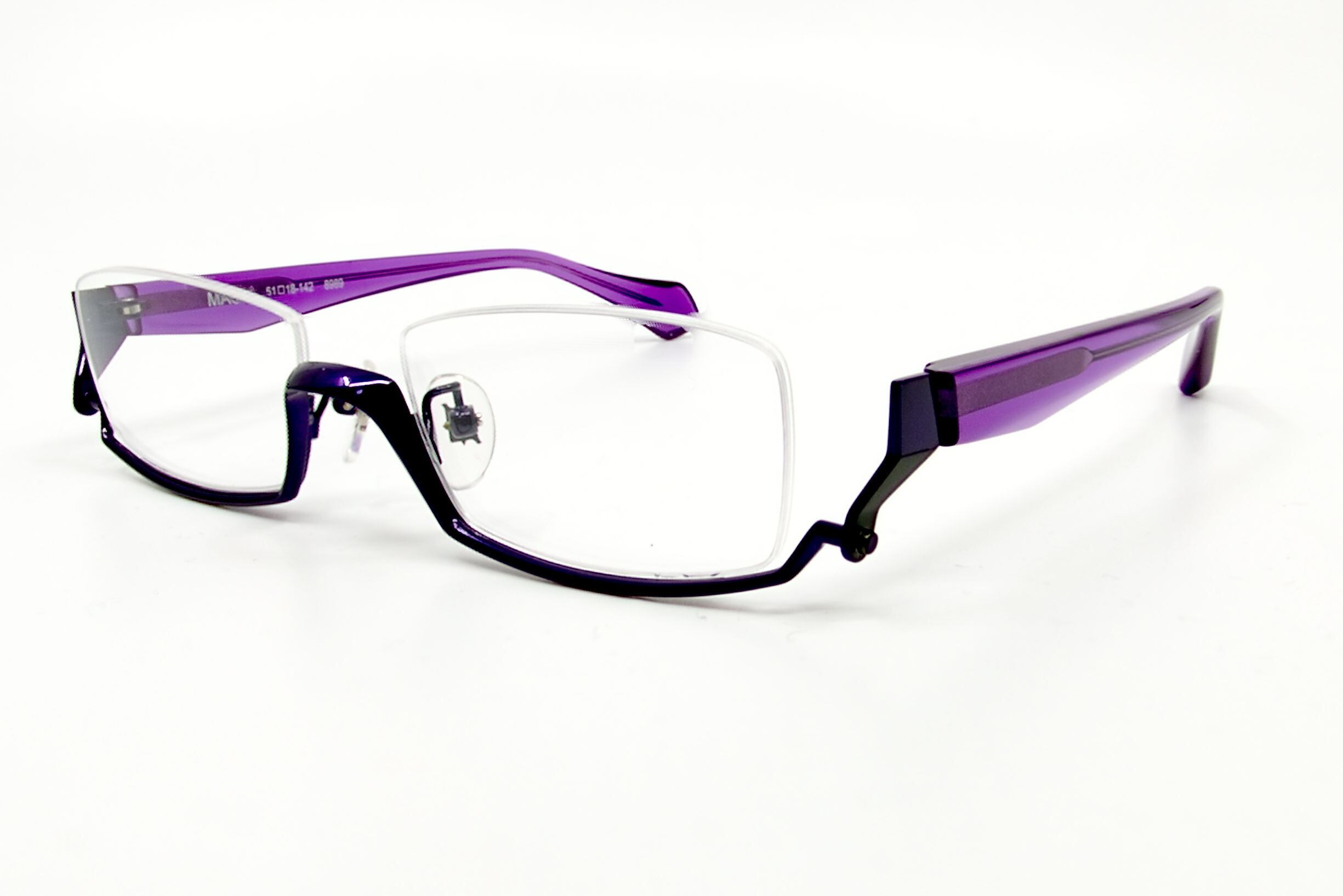 チタン素材で作られた板状のフロントリムがパイプ状に変化しそのまま智を打ち抜いたようなデザインになっていてシンプルでありながら洗練されたメタルの美しさを表現しています。
