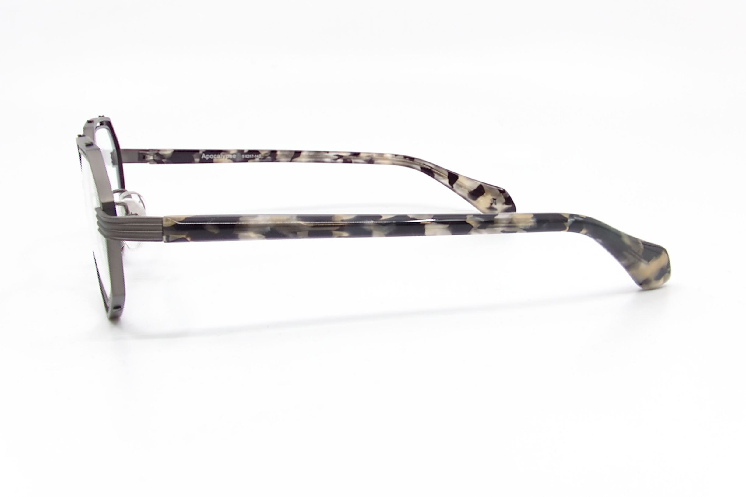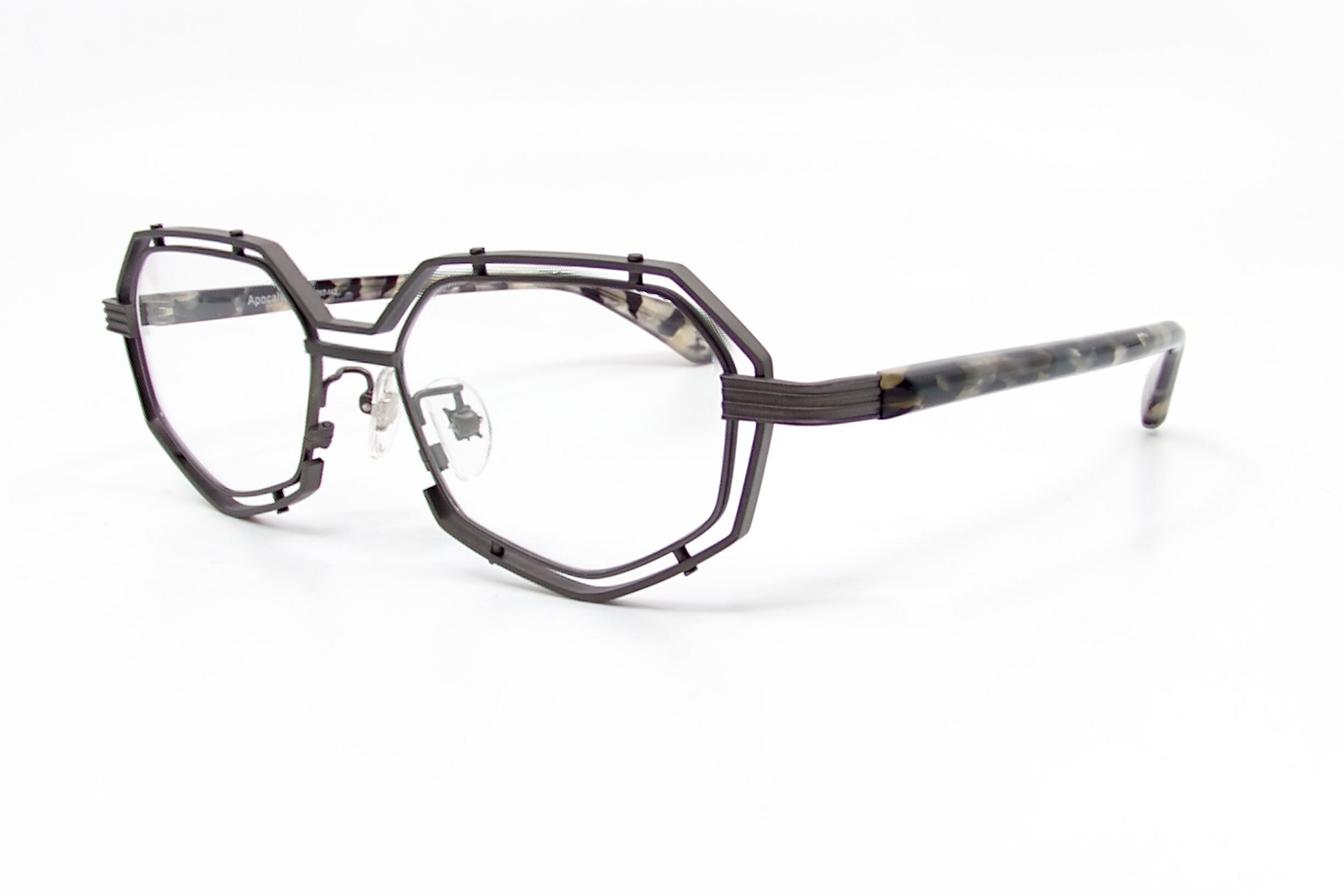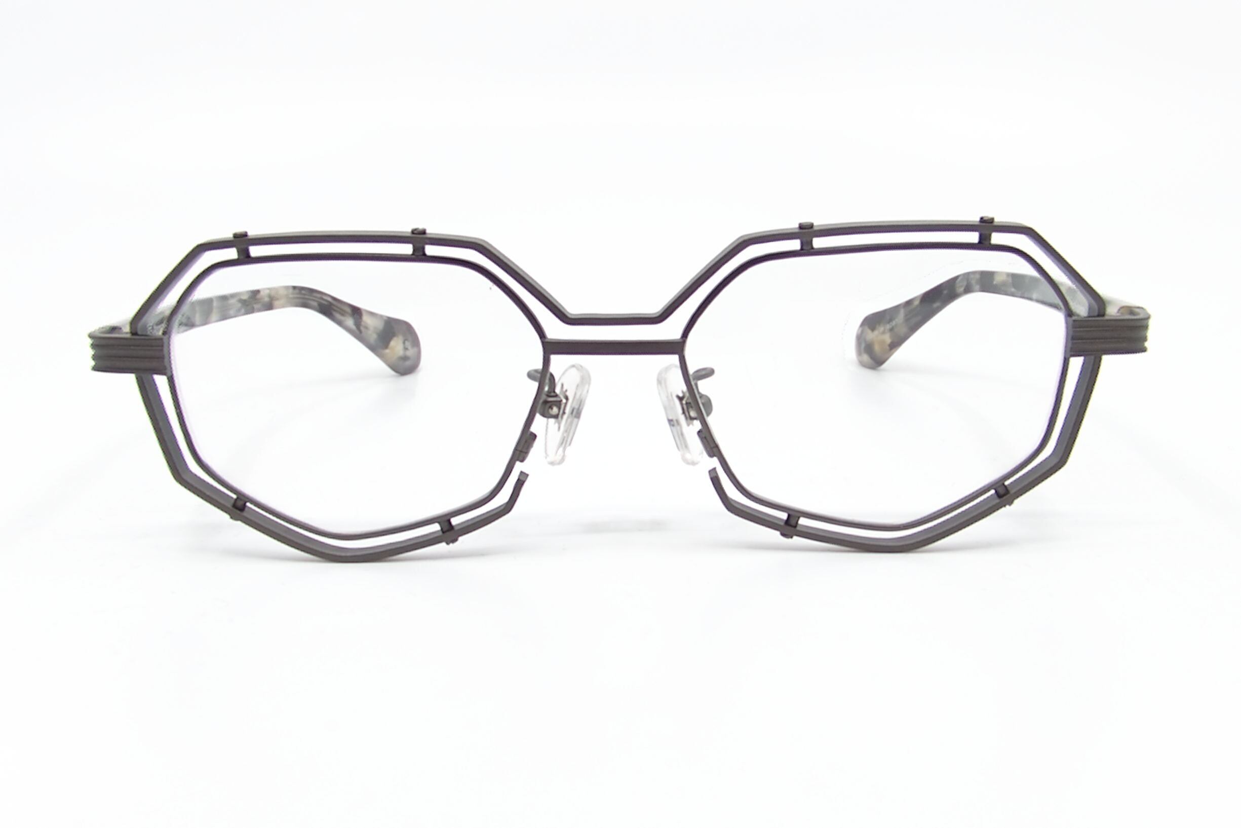 レンズを留めるリムの外周を覆うようにもう一つリムを加え、ブリッジと智の他、4点のビスで留めた独特な構造が特徴的です。