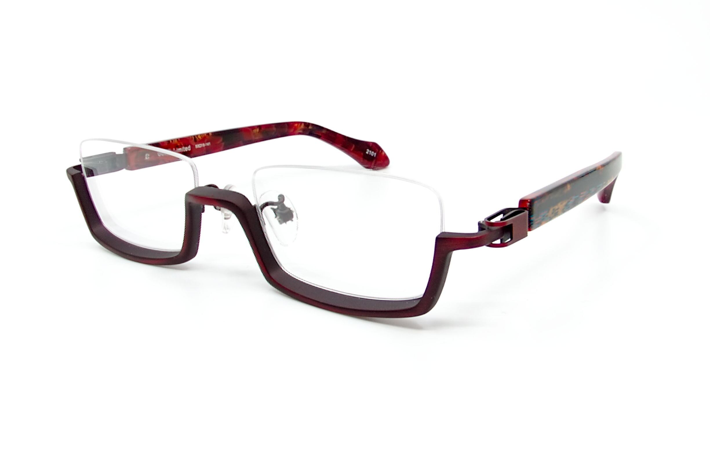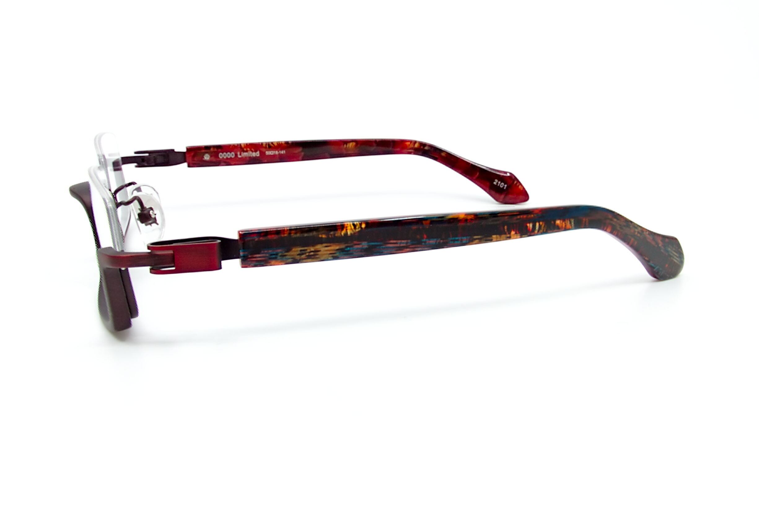 カラー2101は汚し加工を施したレッドのメタルパーツとレッドにブルー、ゴールドを混ぜた柄のアセテート生地を使ったテンプルの組み合わせです。