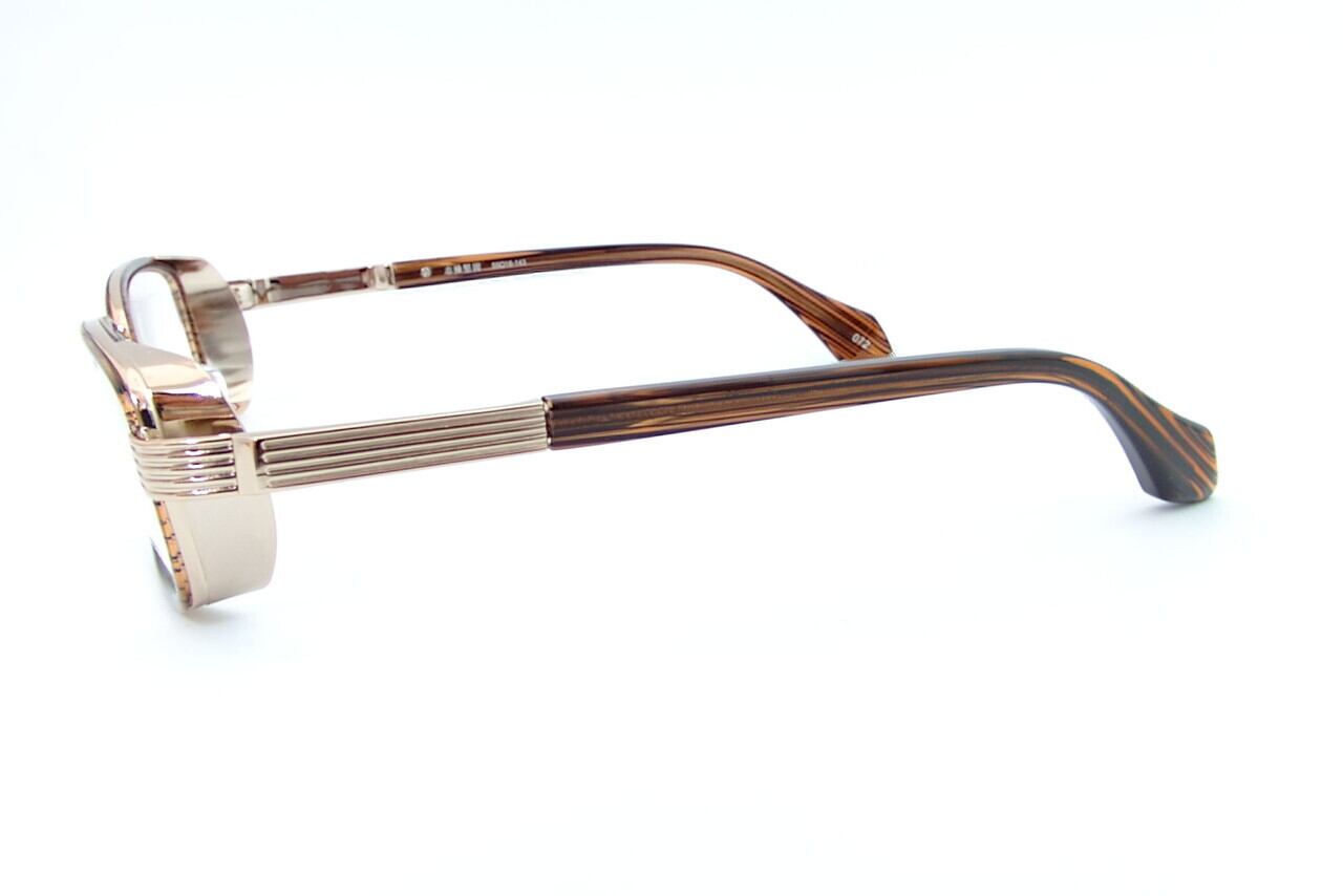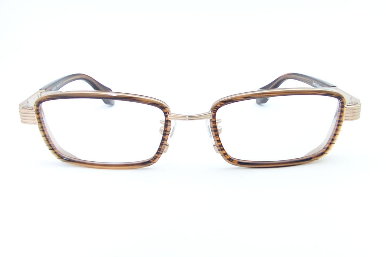 col.72はゴールドのメタルパーツと木目風のラインが入ったブラウンのセル生地の組み合わせになっています。
