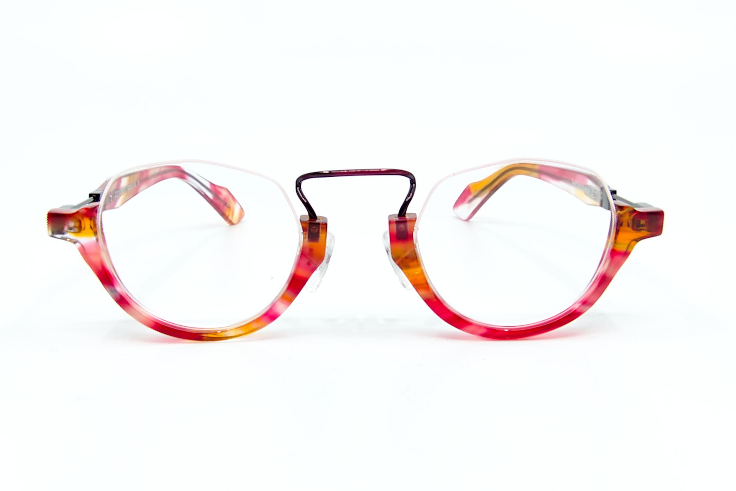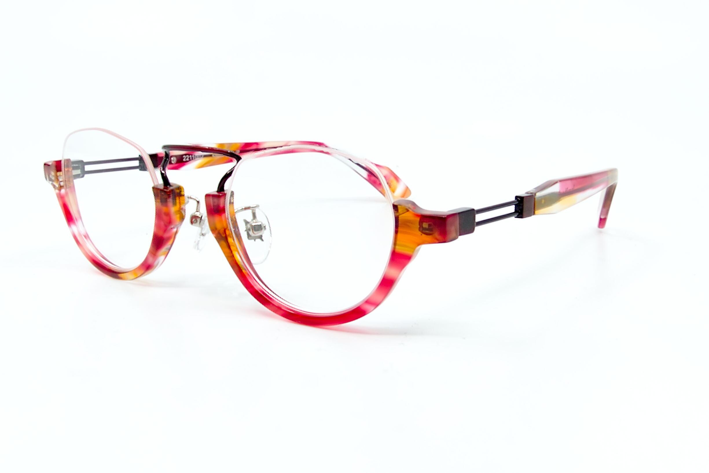 カラー2101はクリアレッド、クリアオレンジ、クリアの3色柄のアセテート生地とワインレッドのメタルパーツの組み合わせです。