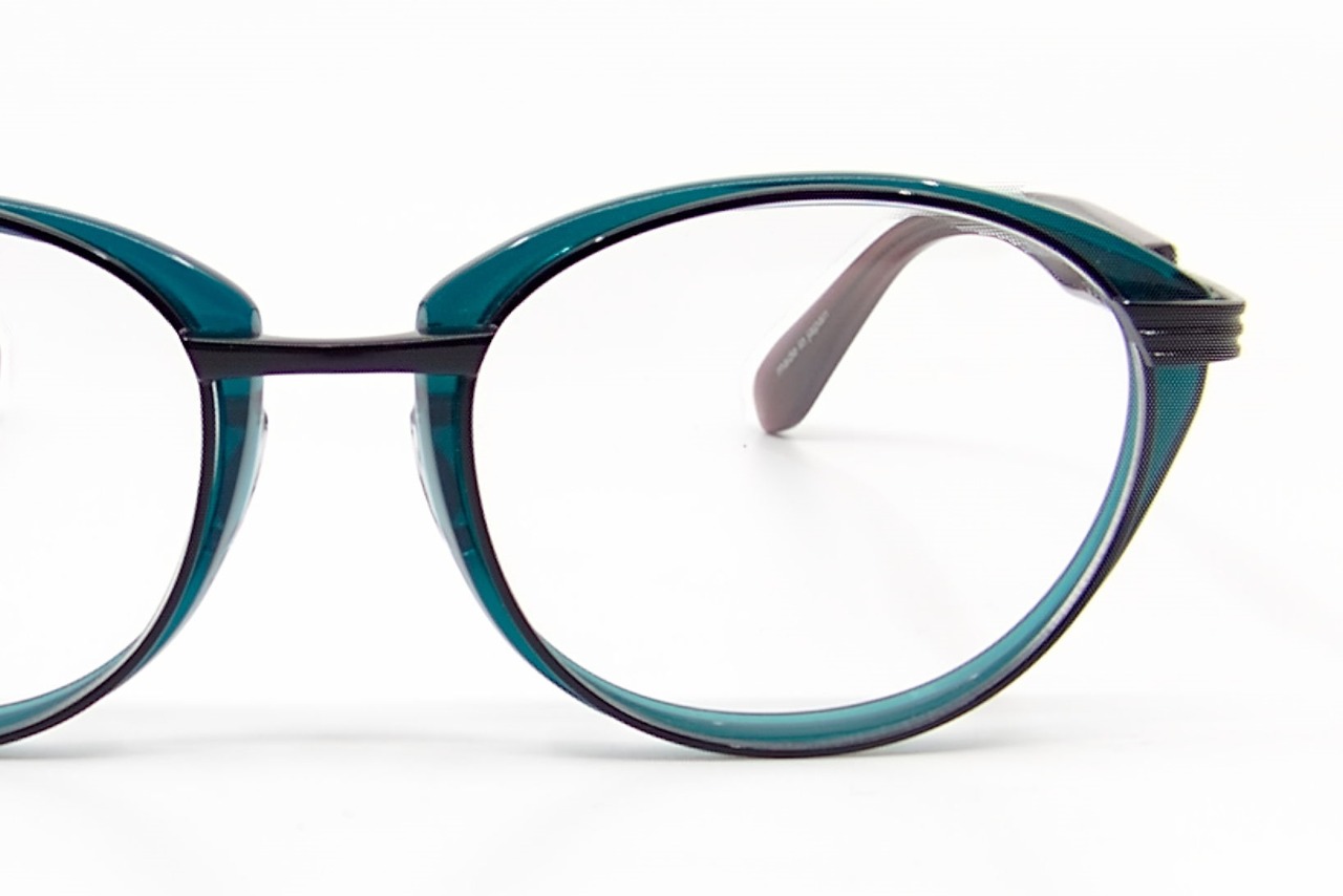 カラー195はブラックのメタルパーツ、深いアクアグリーンのセル生地をフロントリムにクリアブラウンのセルテンプルを使用しています。